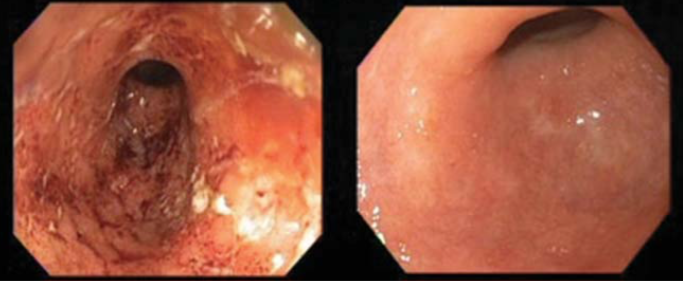 Obrázok: Nález vredov v hrubom čreve v decembri 2009 a úplné zhojenie po polročnej liečbe kurkumínom v septembri 2010 podľa článku Lahiff a spol, 2011 (8).